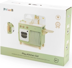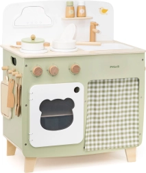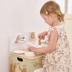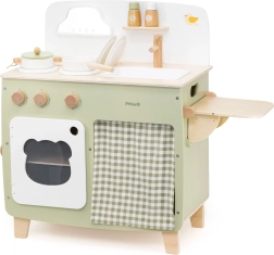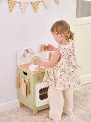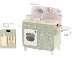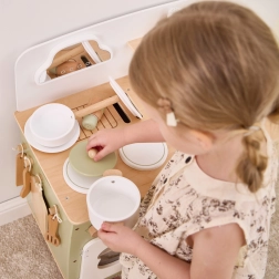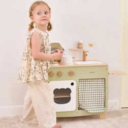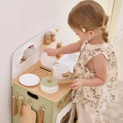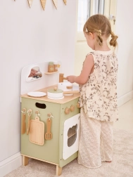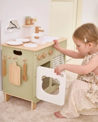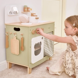 Cette cuisine pour enfants au style élégant dans des tons naturels et verts offre une expérience culinaire réaliste. Grâce à sa structure en bois robuste, à ses boutons rotatifs, à son évier et à son four, les petits chefs profitent d’heures de jeu créatif en toute sécurité. Le plateau latéral rabattable agrandit l’espace pour couper ou manger, tandis que l’armoire avec rideau cache tous les trésors.