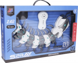 Dans l'emballage, vous trouverez le myriapode avec un bloc de batteries 3,7V, un réservoir d'eau et un câble USB pour un chargement facile. Pour la commande, 2 piles AA sont nécessaires pour la télécommande, qui ne sont pas incluses dans l'emballage.