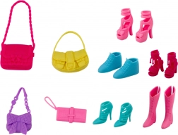 Le coffret comprend une collection d’accessoires de mode, notamment des chaussures et des sacs à main aux couleurs vives telles que rose, jaune, turquoise et violet.