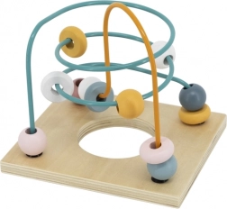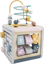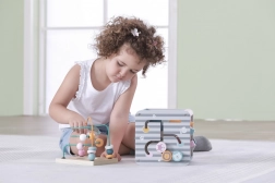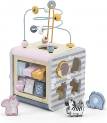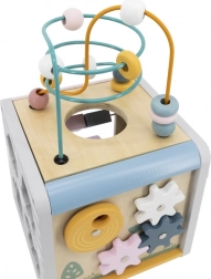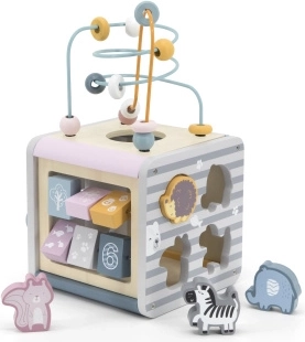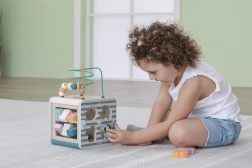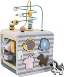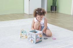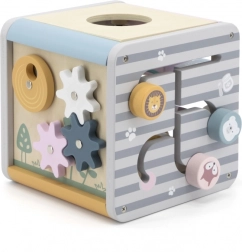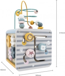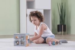 Sur la face supérieure, un labyrinthe métallique à perles développe la motricité fine et la patience. Les parois latérales comprennent une boîte à formes avec animaux, des cubes rotatifs avec chiffres pour les premiers calculs, des engrenages pour comprendre la cause et l’effet, ainsi que des éléments coulissants pour entraîner la coordination.