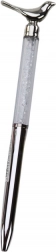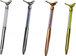 Stylo à bille élégant avec petit oiseau décoratif et corps transparent rempli de strass scintillants. Il offre une encre bleue, une écriture fluide en 0,7 mm et un design stylé en plusieurs couleurs métalliques.