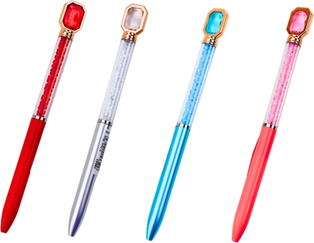 Stylo bille élégant avec cristaux, encre bleue 0,7 mm. Écriture fluide, design stylé, mix de couleurs de corps. Certification CE, norme EN71, longueur 15,5 cm.