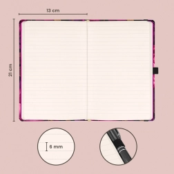 Découvrez la qualité avec ce carnet remarquable de NOTIQUE. Sa couverture rigide protège le contenu tout en offrant un design stylé aux fleurs violettes. Grâce à la fermeture élastique, aucune page ne se perdra.