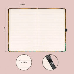 La couverture rigide protège le contenu dans le sac et en déplacement, l’élastique maintient le carnet bien fermé, le passant intégré garantit que vous aurez toujours un stylo à portée de main, et la poche intérieure accueille cartes de visite et petits objets. 172 pages de papier jaune offrent suffisamment d’espace pour toutes vos idées.