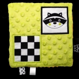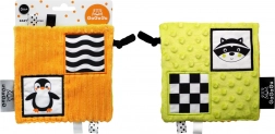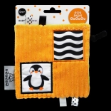 Le design réversible propose deux illustrations attrayantes — pingouin et raton laveur — ainsi qu’une multitude de détails à explorer : rubans, boucles en peluche et grande étiquette pour une prise en main facilitée. Ces éléments soutiennent la coordination œil-main et l’entraînement de la motricité fine.