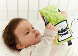 Le matériau bruissant et la variété de rubans, boucles et étiquettes développent l’ouïe, la coordination œil-main et la motricité fine lors du jeu dans le lit ou la poussette.