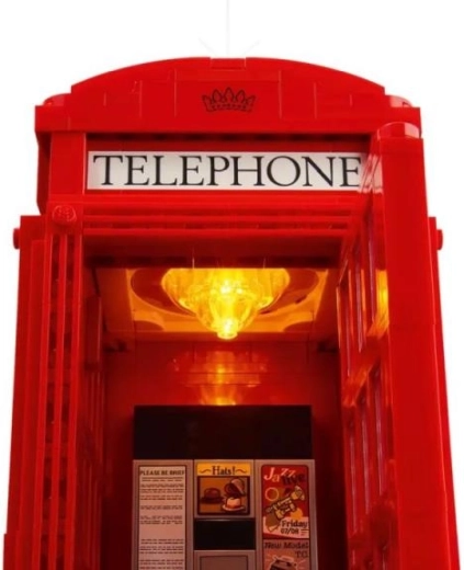 Le modèle propose une configuration intérieure au choix : optez pour le téléphone classique à cadran rotatif ou pour la version inspirée des années 90. En appuyant sur le toit, vous activez le bloc lumineux qui met en valeur les détails intérieurs. Grâce à une conception ingénieuse, la cabine sert aussi de support pratique pour téléphone.