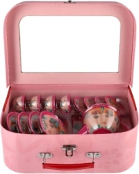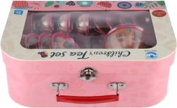 Le service à thé est rangé dans une valisette rigide avec poignée et fermeture métallique. Les enfants peuvent l’emporter partout et le ranger facilement après le jeu.