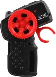 Émetteur moderne avec grande course de direction et gâchette pour une accélération fluide, permettant des manœuvres précises sans interférences.