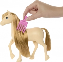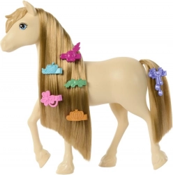 Adorable cheval inspiré de la série BARBIE Mystères : La grande chasse, pour des heures de jeu créatif. Il possède une crinière et une queue extra longues et coiffables, auxquelles vous pouvez fixer des barrettes colorées et une mèche de cheveux. Un peigne est inclus pour un coiffage facile. Idéal pour les petites coiffeuses et les amoureux des chevaux.