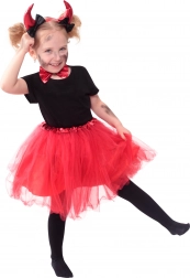 La jupe possède une taille élastique pour un enfilage facile et un port agréable. L’ensemble est complété par un serre-tête à cornes et un élégant nœud papillon pour le cou, qui finalisent le look diabolique sans nécessiter d’accessoires supplémentaires.