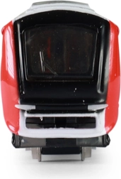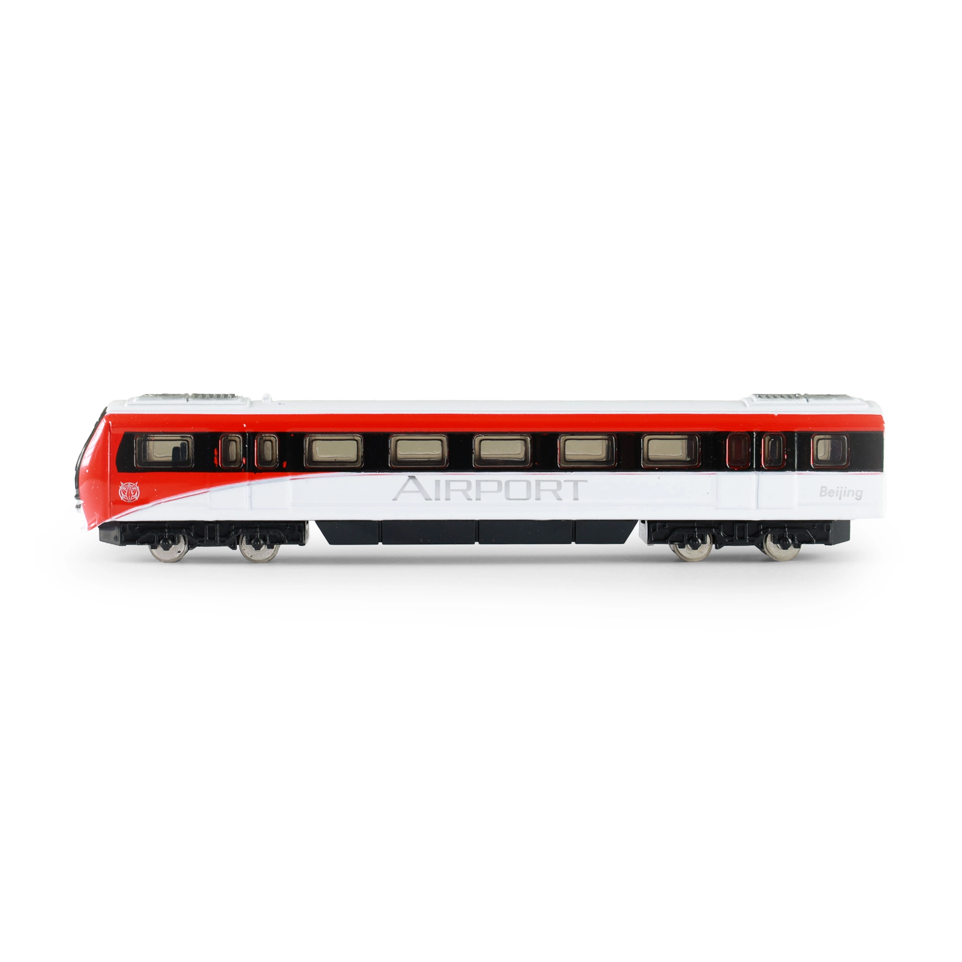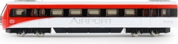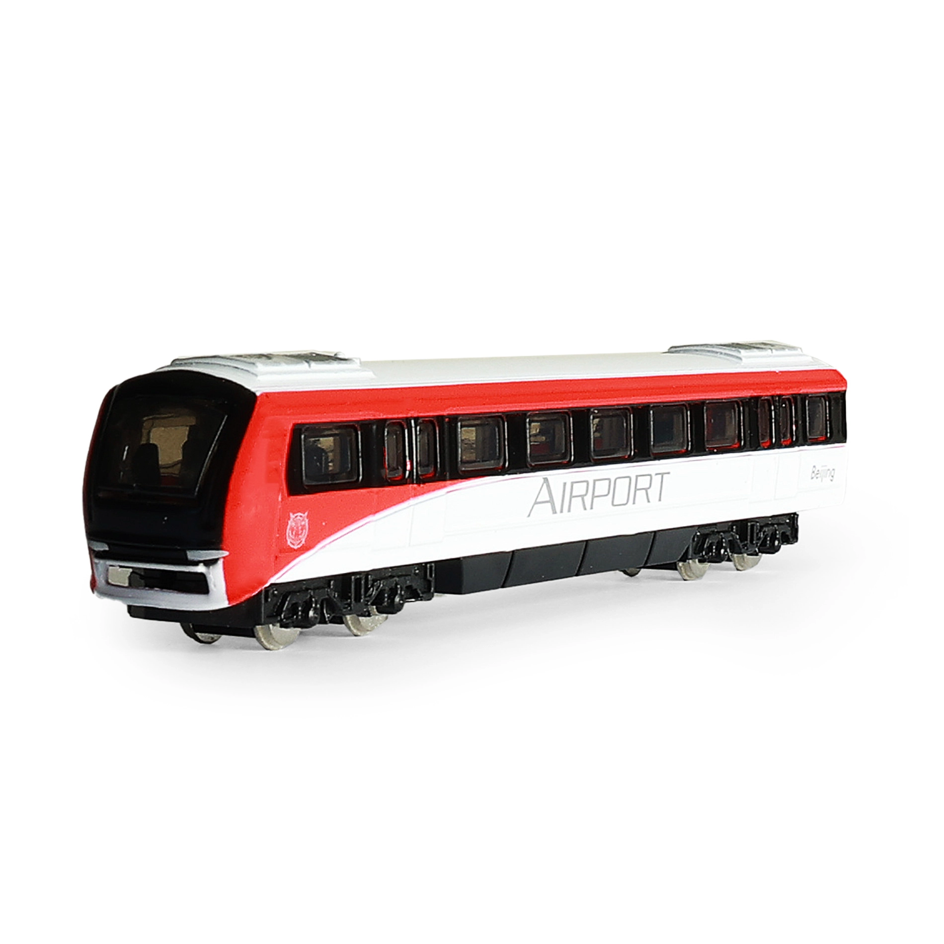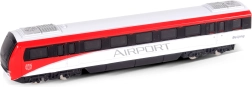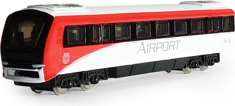 Fenêtres détaillées, bogies et livrée rouge et blanche confèrent au modèle une apparence authentique inspirée d’un train d’aéroport.