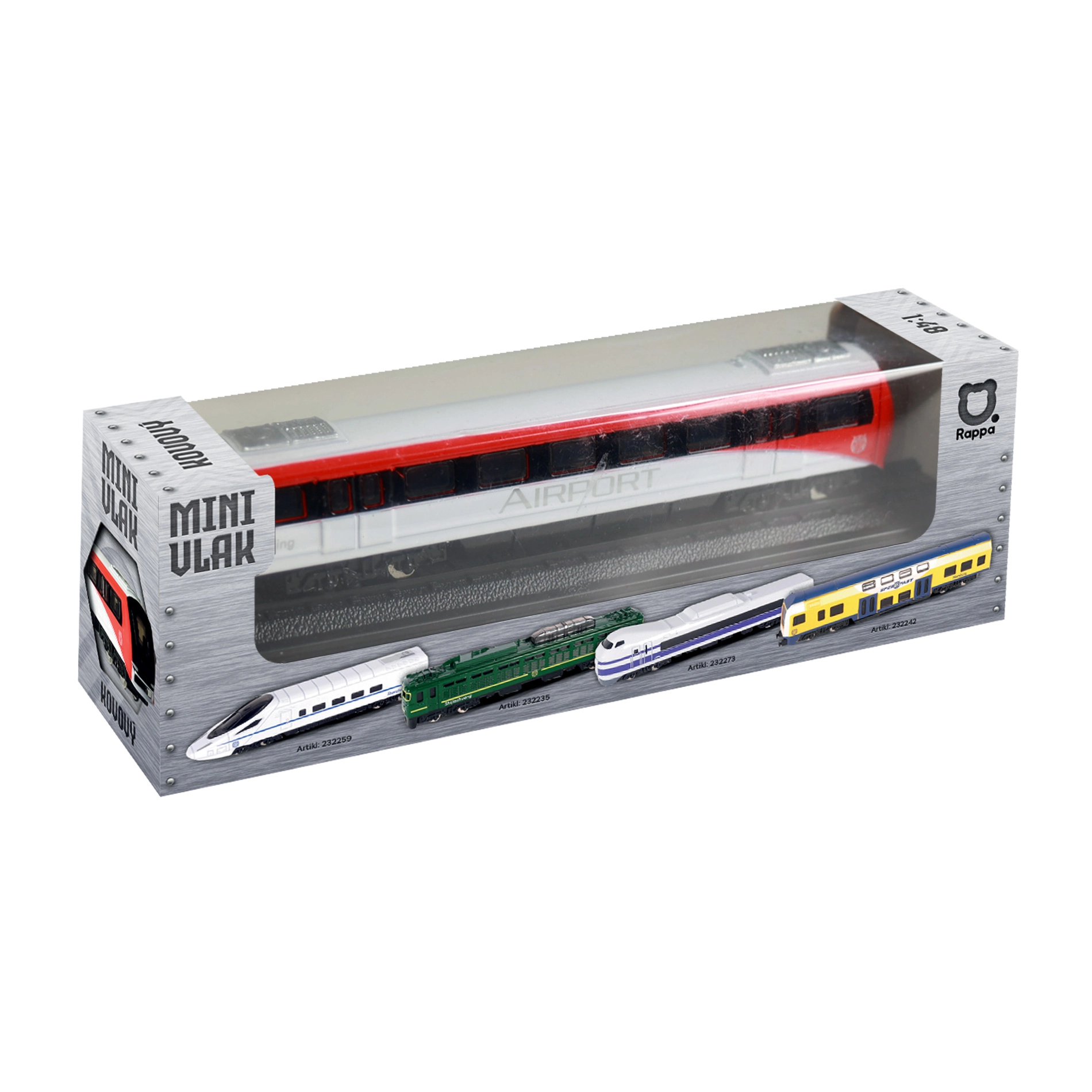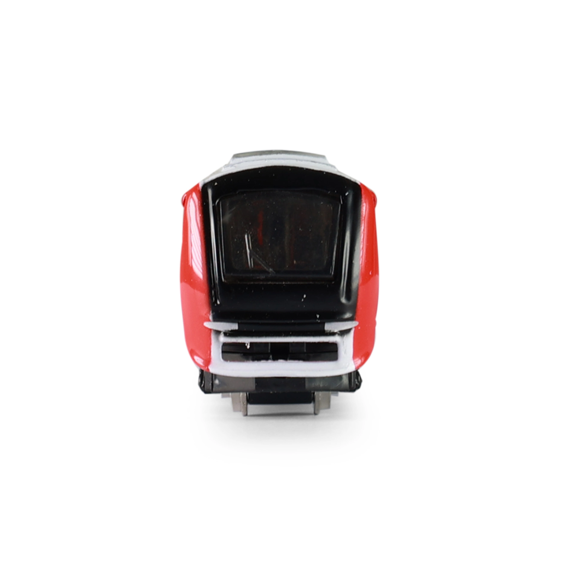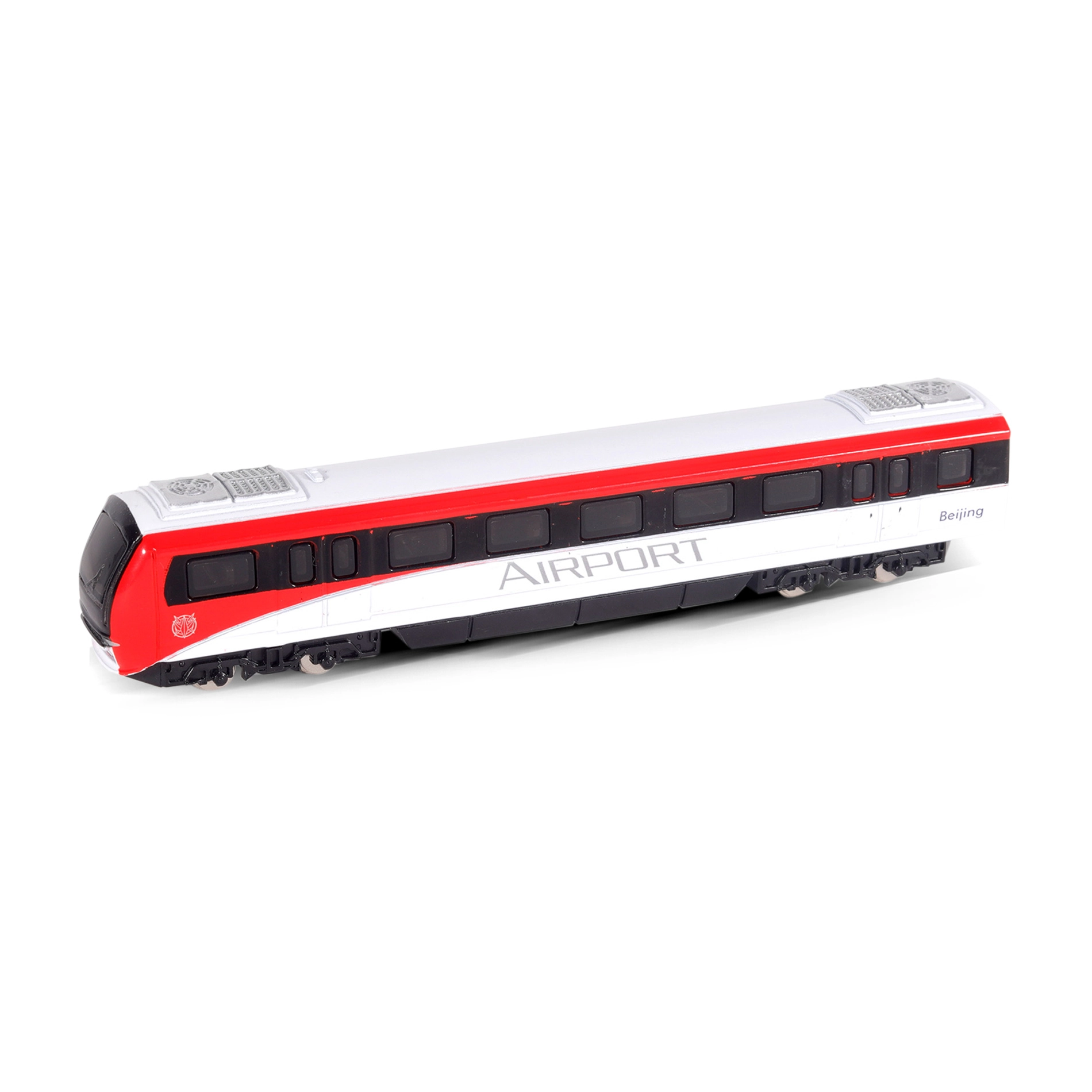 Fenêtres détaillées, bogies et livrée rouge et blanche confèrent au modèle une apparence authentique inspirée d’un train d’aéroport.