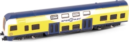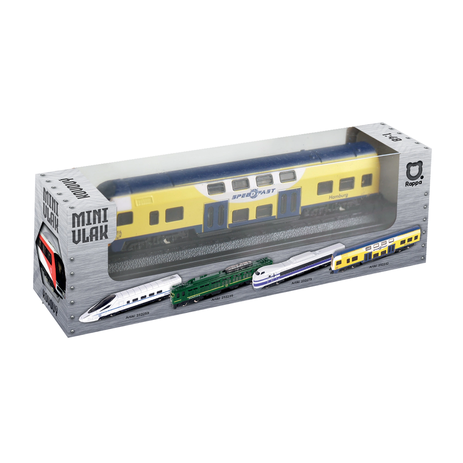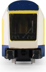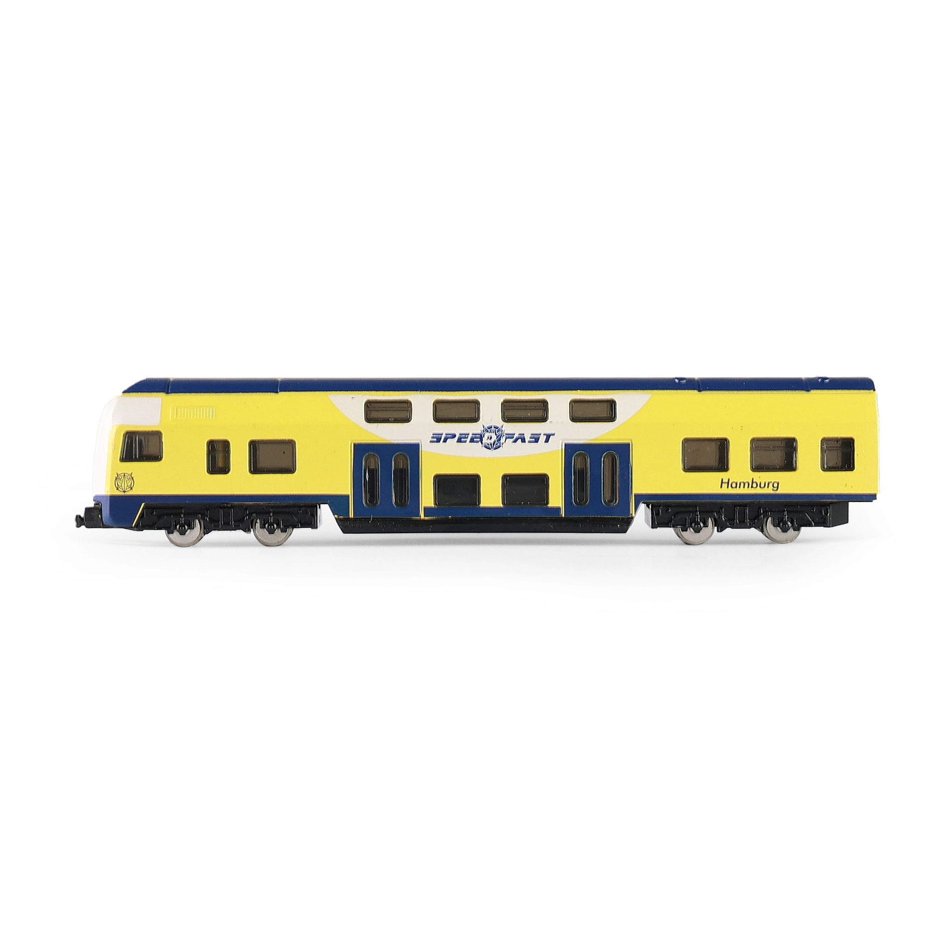 Grâce à la roue libre, le train roule en douceur d’une légère poussée, sans piles. Les parties métalliques augmentent la résistance, tandis que le rendu fidèle des fenêtres et des portes ravira tout fan de modélisme ferroviaire.