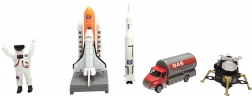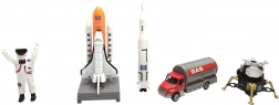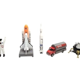 - Figurine de cosmonaute, fusée, navette sur rampe de lancement, module lunaire, camion-citerne