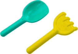 Ce set complet pour le sable est idéal pour les petits bâtisseurs. Son élément central est un moulin à sable à deux roues – sur le dessus se trouve un tamis pour tamiser le sable et, de l’autre côté, un entonnoir pour des expériences ludiques avec l’eau et le sable. Il comprend également des outils pratiques : une pelle pour ramasser et transporter, et un râteau pour façonner et lisser.