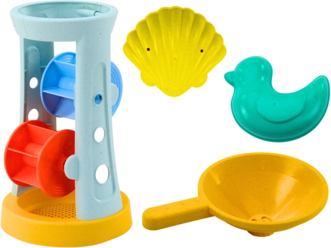 Les deux roues du moulin dynamisent chaque séance de jeu. Le tamis sépare les particules fines, tandis que l’entonnoir facilite le versement de l’eau ou du sable et la création d’effets.