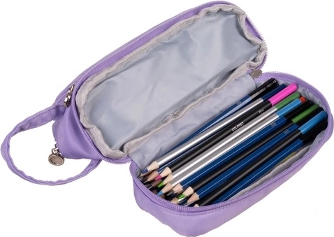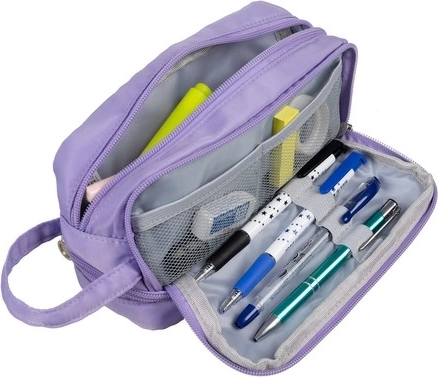 Élégante trousse scolaire violette pour fournitures d’écriture, avec trois compartiments spacieux. Idéale pour une meilleure organisation.
