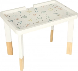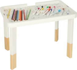 La table est fabriquée en bois de qualité avec bords arrondis et peinte avec des peintures non toxiques. Elle répond aux normes de sécurité européennes (CE). Grâce à son plateau pratique, elle sert aussi d'espace pour écrire, dessiner et créer.