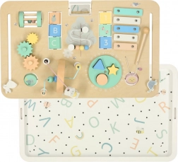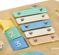 Le xylophone, le jeu d'encastrement de formes, les engrenages avec curseurs et le labyrinthe de perles occupent les enfants longtemps et développent naturellement la motricité fine et la logique.