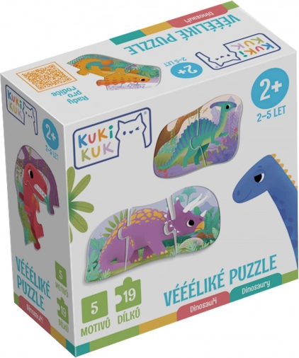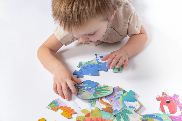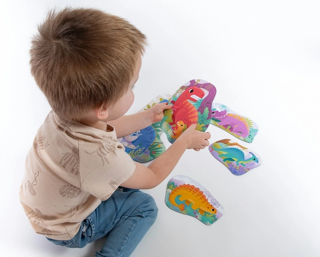 Chaque dinosaure constitue un puzzle séparé à la forme simplifiée. Les enfants s’exercent à l’assemblage tout en découvrant le monde des créatures préhistoriques.