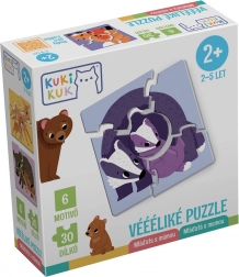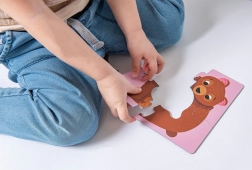 Ce set comprend six puzzles carrés illustrant des familles d’animaux – ours, renard, blaireau, sanglier, biche et oiseau. Chaque motif est composé de quatre grandes pièces pour une taille finale d’environ 15,5 × 15,5 cm. Les mêmes formes d’encoches de connexion incitent les enfants à tester de manière systématique et à associer correctement, tandis que les pièces centrales des bébés ont la même forme pour tous les motifs.