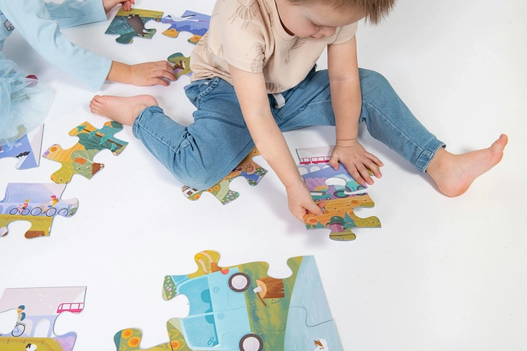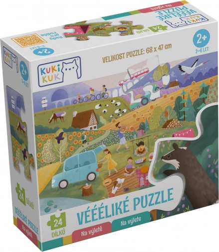Ce grand puzzle pour enfants se compose de 24 pièces extra grandes et, une fois assemblé, forme une image de 675 × 470 mm. La forme des connecteurs est conçue pour n’emboîter que les parties correctes de l’image, ce qui aide les enfants à comprendre les liens et renforce leur patience. Les pièces sont fabriquées en carton rigide de qualité de 2 mm d’épaisseur, résistant même aux manipulations plus énergiques.