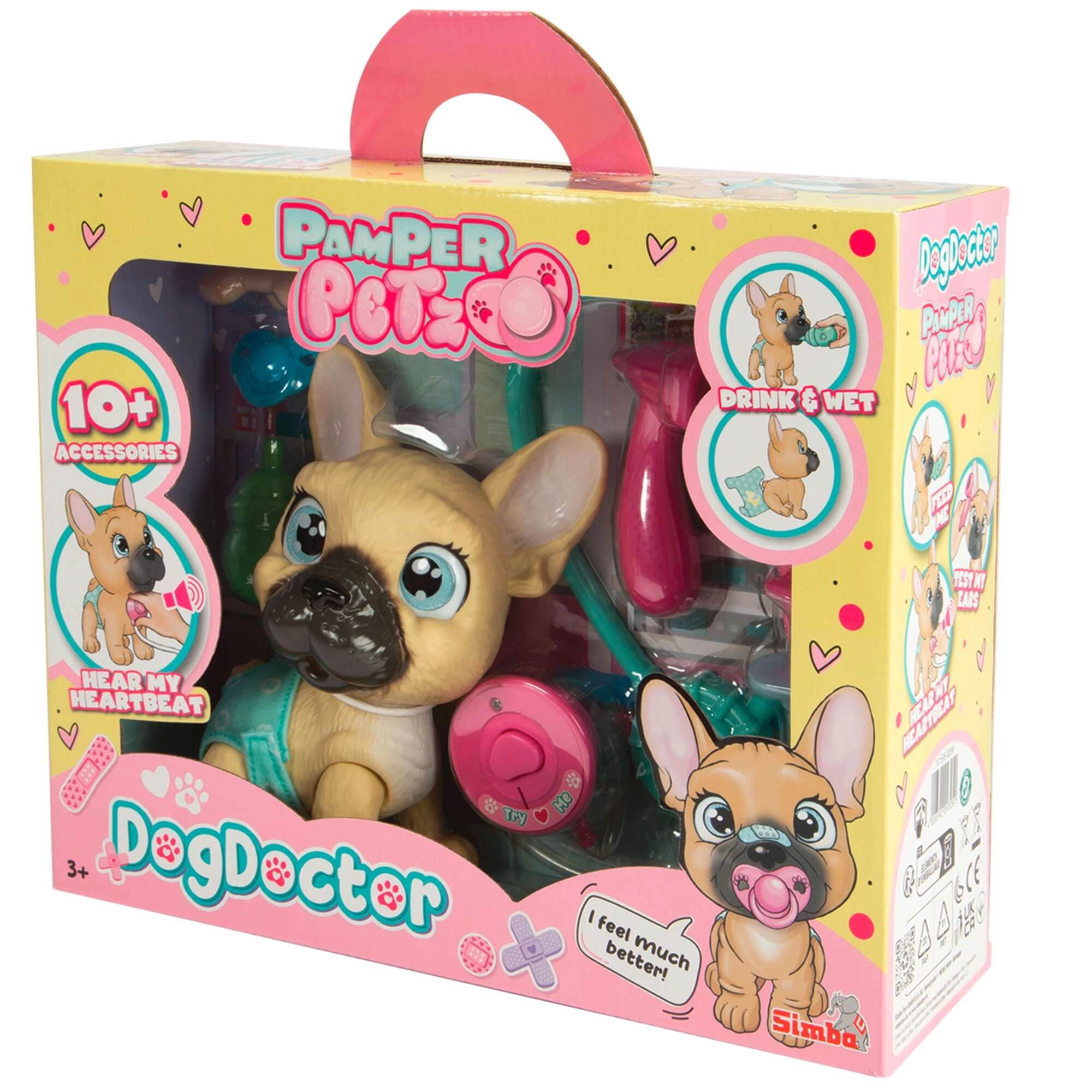 Découvrez le chiot adorable de la collection PAMPER PETZ avec un set vétérinaire pour des soins et un jeu réalistes. Le bouledogue français de 17 cm sait boire de l’eau et faire pipi dans une couche, qui change de couleur en jaune lorsqu’elle est mouillée. Il attend son petit soigneur avec plus de 10 accessoires, dont un stéthoscope avec son, et offre aussi une patte magique qui révèle le sexe de l’animal après l’avoir frottée avec de l’eau.