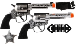 Devenez un véritable cow-boy ! Ce set amusant pour petits tireurs comprend 2 pistolets en plastique de 19 cm, des étuis de ceinture et un badge de shérif, ainsi que d’autres accessoires pour un jeu authentique. Idéal pour le carnaval, les déguisements et les aventures à la maison. Conception sûre avec embouts orange, convient aux enfants dès 3 ans.