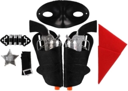 - 2 pistolets en plastique, 2 étuis, badge de shérif, ceinture; selon la variante, peut inclure un masque et un foulard
