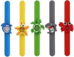 Montre ludique pour enfants avec motifs d’animaux marins, idéale pour apprendre l’heure et offrir un port confortable. Grâce au bracelet en silicone à enroulement automatique (slap), la montre s’enfile d’un simple « coup » du poignet. Des aiguilles de couleurs distinctes aident les enfants à mieux lire l’heure et la pile LR626 intégrée permet une utilisation immédiate. Disponible en 5 motifs joyeux – dauphin, étoile de mer, tortue, requin et crabe.