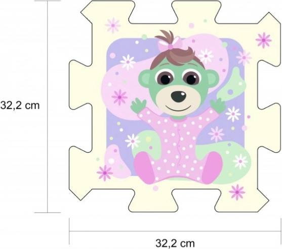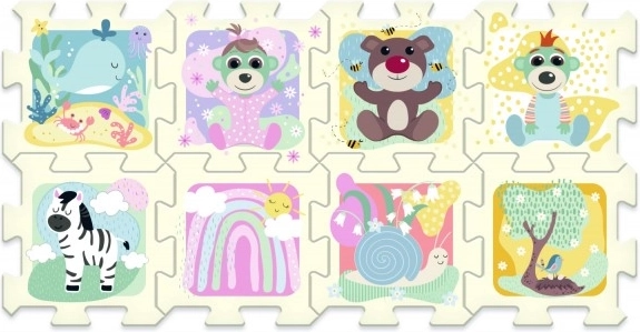Tapis en mousse souple et sûr composé de 8 grandes pièces avec les motifs BOBASKI I MIŚ, protégeant du froid, absorbant les chocs et servant également de jouet éducatif. Les pièces de 30 × 30 × 1,5 cm peuvent être assemblées en volume ou former un tapis isolant doux de 118 × 60 cm. Sans BPA, sûr dès 0+, certifications CE et EN71.