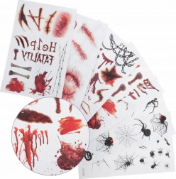 Chaque feuille propose différents motifs – des éclaboussures de sang aux araignées et cicatrices. Les motifs sont fournis en assortiment, le choix n’est pas possible.