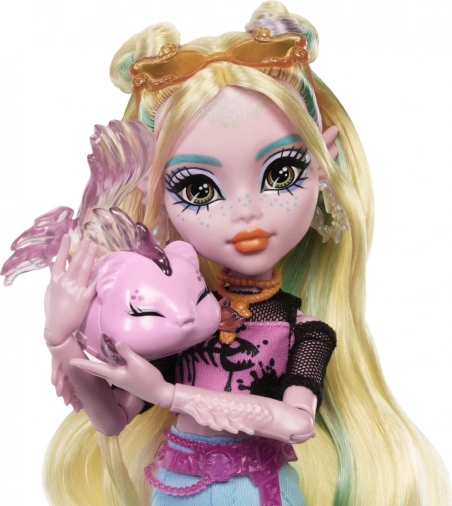 La poupée Lagoona Blue est prête à régner sur les profondeurs comme sur les tendances. Elle a de longs cheveux partiellement coiffés avec des mèches pastel, un top rose à motif arête de poisson et un pantalon coloré dans le style Y2K. Grâce à ses articulations, elle est facile à positionner et idéale pour des scénettes inventives et des prises de vue.