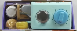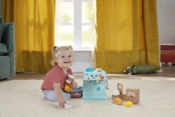 Les enfants peuvent appuyer sur les boutons pour simuler la préparation du café, tourner le bouton pour faire mousser ou manipuler le moulin à café pour voir les grains de café surgir. Sont inclus aussi des accessoires de jeu: deux gobelets à café, une cuillère, un croissant, un sac mou avec couvercle, un gobelet à lait et un plateau de service.
