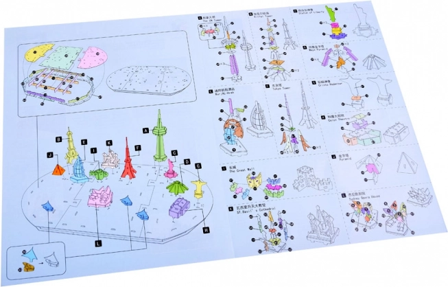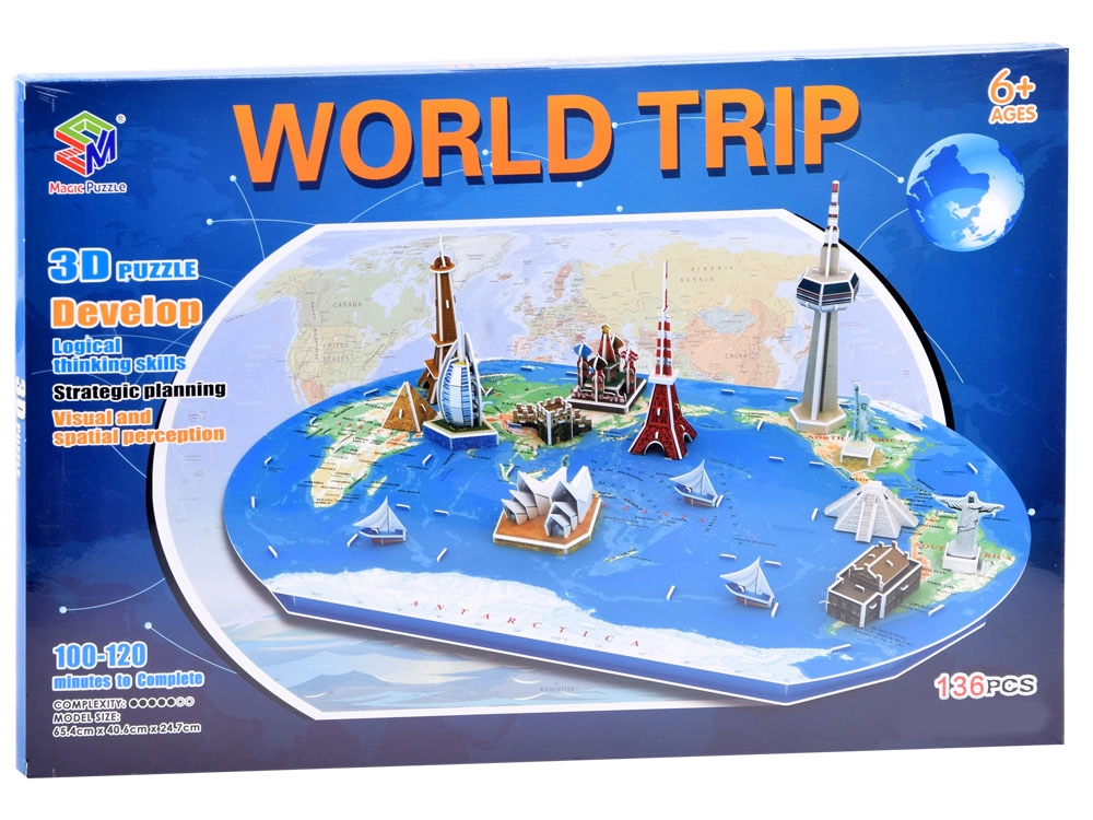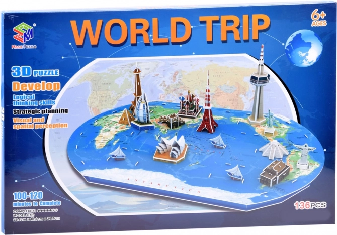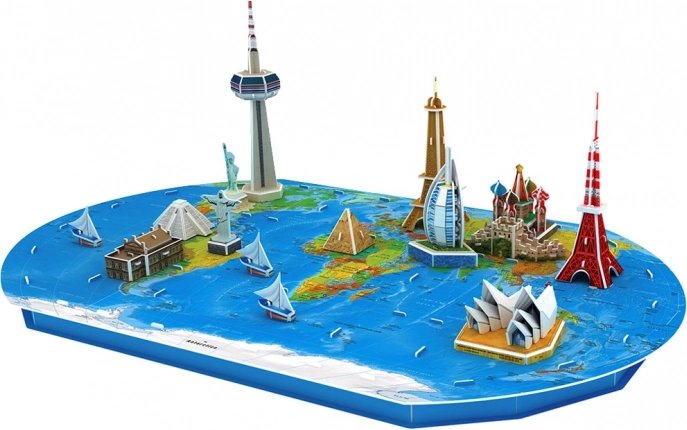 La carte présente des icônes mondiales telles que la tour Eiffel, l’Opéra de Sydney ou la Statue de la Liberté, entre autres. Le modèle assemblé mesure environ 65,4 × 40,6 × 24,7 cm, parfait comme décoration pour une chambre d’enfant ou une salle de jeux.