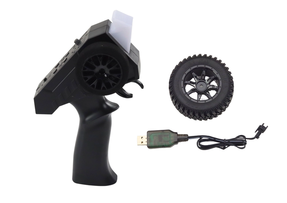 Le véhicule est également doté de feux fonctionnels à l’avant et à l’arrière, ce qui renforce non seulement son réalisme mais augmente aussi sa jouabilité dans des conditions de faible luminosité ou de nuit. Le contrôle s’effectue via une télécommande 2,4G de dernière génération, assurant une conduite précise. La télécommande permet une plage complète de mouvements et un changement de vitesse à deux niveaux, vous permettant d’adapter le rythme de conduite à vos besoins et préférences. La fonction de freinage par relâchement permet en outre d’arrêter rapidement et en toute sécurité et de réagir aisément aux obstacles.