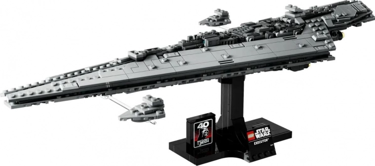 Le support élégant avec plaquette et tuile spéciale pour le 40e anniversaire met en valeur les lignes élancées de l’Executor Super Star Destroyer et transforme le modèle en pièce maîtresse décorative.