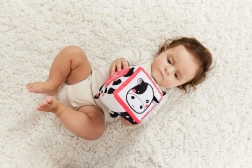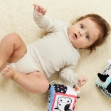Le fort contraste des motifs noir et blanc avec des détails colorés stimule la vision et maintient l’attention de bébé pendant le jeu.
