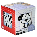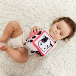 Ce cube sensoriel tout doux est conçu pour les plus petits explorateurs. Chacune des six faces offre une expérience sensorielle différente – des motifs contrastés noir et blanc avec des accents colorés jusqu’aux tissus et surfaces variés qui invitent au toucher et à la découverte. Les adorables motifs de vache et de tigre stimulent la curiosité et aident l’enfant à percevoir formes et émotions.