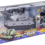 Coffret d’action pour enfants, fun dès le déballage : un char à ressort (friction) 21 cm lanceur avec garage lanceur pour petites voitures, 8 fléchettes, 3 véhicules militaires et un hélicoptère. Commande mécanique sans piles et de multiples possibilités de jeu.