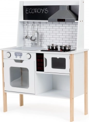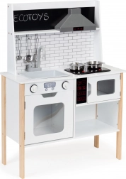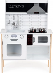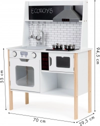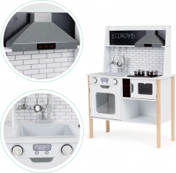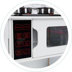 Cette cuisine pour enfants en bois massif offre tout ce dont les petits MasterChefs ont besoin : plaques éclairées avec sons de cuisson, four, micro-ondes et placards spacieux pour ranger les accessoires. La partie supérieure est complétée par une hotte et des crochets pour ustensiles, afin que tout soit toujours à portée de main.