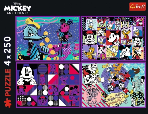 Coffret de puzzles 4×250 pièces avec motifs MICKEY MOUSE. Chacun mesure 340 × 240 mm. Divertissement et apprentissage réunis – développement de la patience, de la perception et de la concentration.