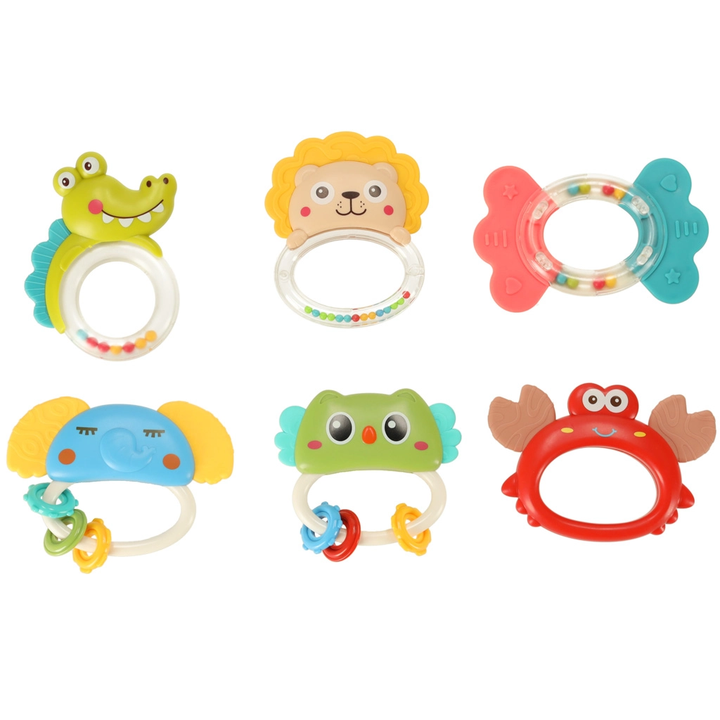 Ce set coloré de 6 hochets et anneaux de dentition sensoriels est un compagnon idéal dès les premiers jours de bébé. Chaque jouet séduit par sa forme et sa couleur uniques, et grâce à ses bords souples, il sert de mordeur délicat pendant la poussée dentaire.