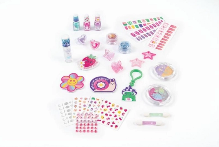 - Contenu de l’ensemble : fards à paupières, paillettes pour le corps, gloss à lèvres, vernis à ongles, wraps pour ongles, limes, autocollants pour ongles, strass pour ongles.