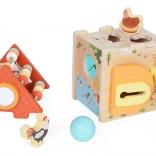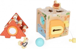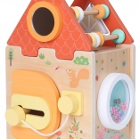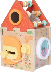 Ce jouet est idéal pour le développement des enfants, car chaque côté de la maisonnette cache de nouvelles aventures. Que ce soit pour insérer, déplacer ou les serrures. Le cube contient également un abacus qui sert de toit à la maisonnette.