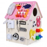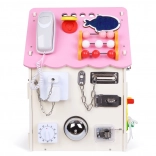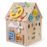 Maison interactive en bois avec de nombreux éléments sensoriels et éducatifs qui développent la motricité fine, la coordination œil-main et l’autonomie. Les enfants s’exercent de manière ludique à fermer, lacer, basculer, tourner et déverrouiller, tout en se familiarisant avec le boulier et l’horloge.