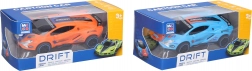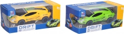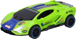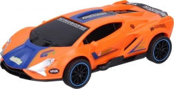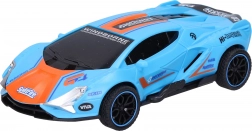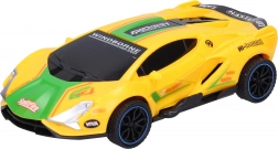 Petite voiture de course à inertie de dimensions 15,5 × 8 × 4 cm. Il suffit de la lancer et, grâce à une petite roue placée perpendiculairement au centre du châssis, elle drifte toute seule. Disponible en 4 couleurs – bleu, vert, orange, jaune; amusement sans piles.