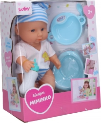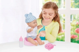 Bébé réaliste de 30 cm pour jouer aux parents, capable de faire pipi après avoir bu au biberon et d’émettre jusqu’à 10 sons différents. Inclus: petit pot, biberon, assiette et cuillère. Piles 3× AG13 incluses.