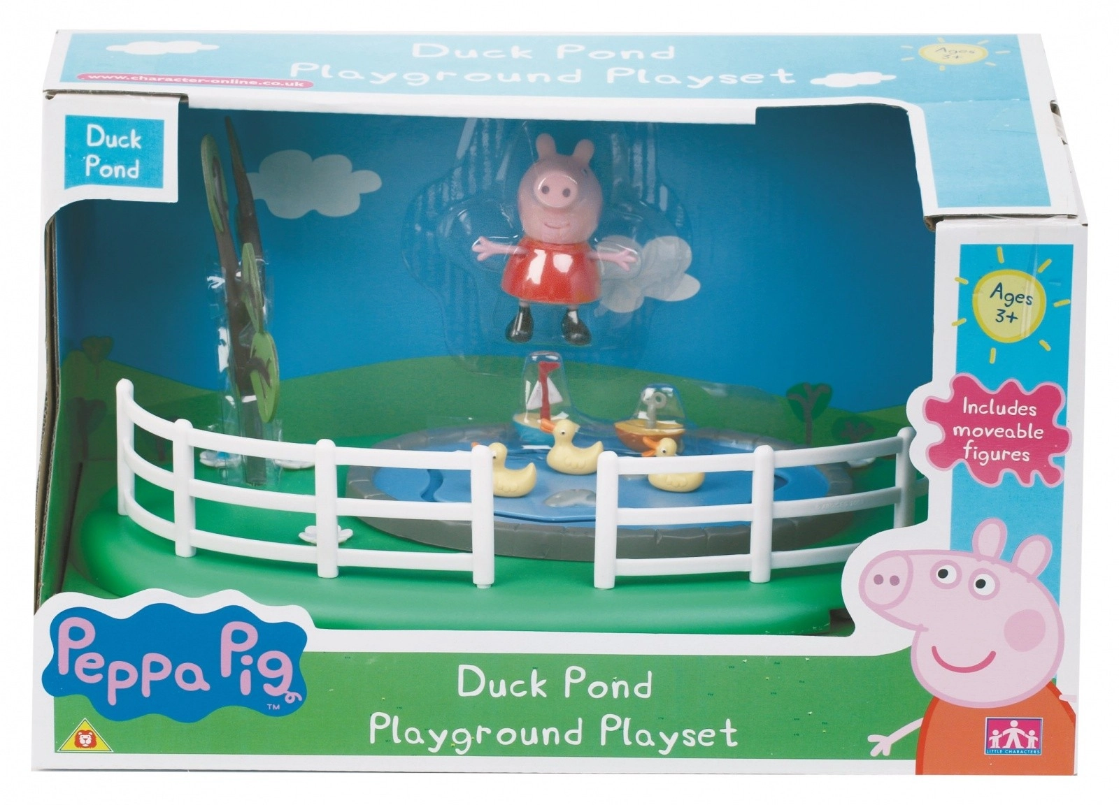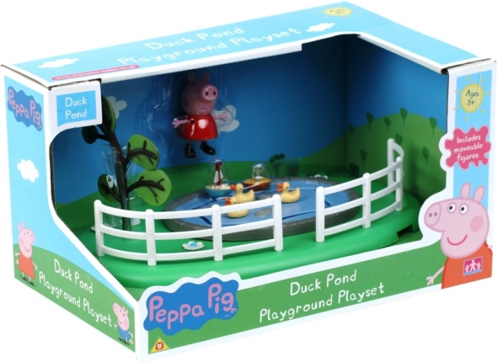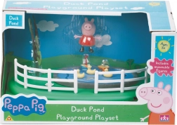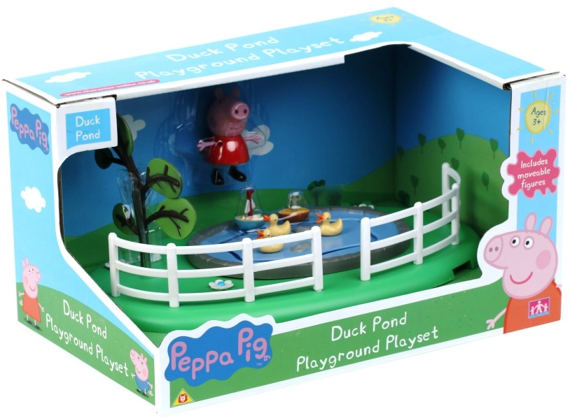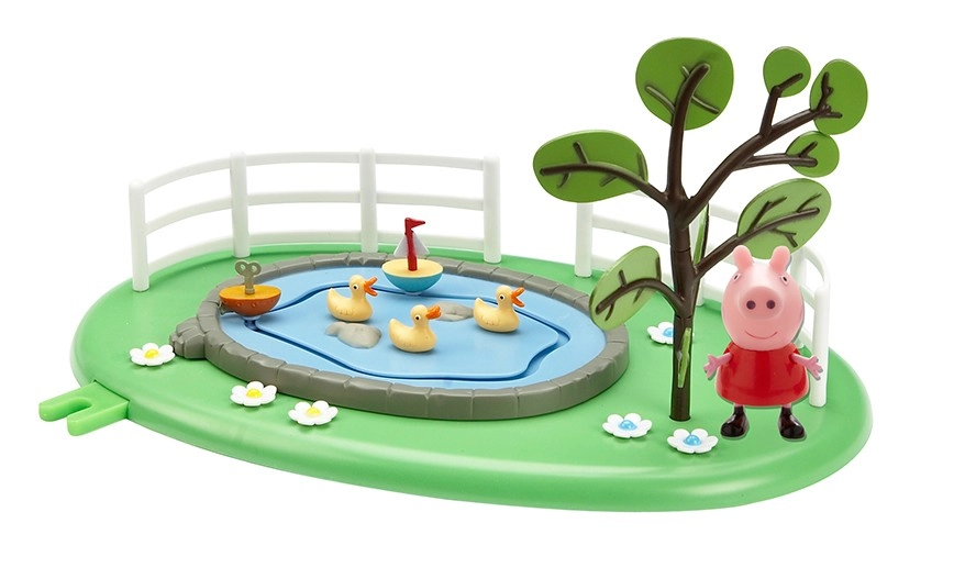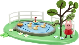 Scène avec surface d’eau bleue, clôture et arbre. Les enfants peuvent placer les figurines autour de l’étang et inventer des histoires avec Peppa au bord de l’eau.